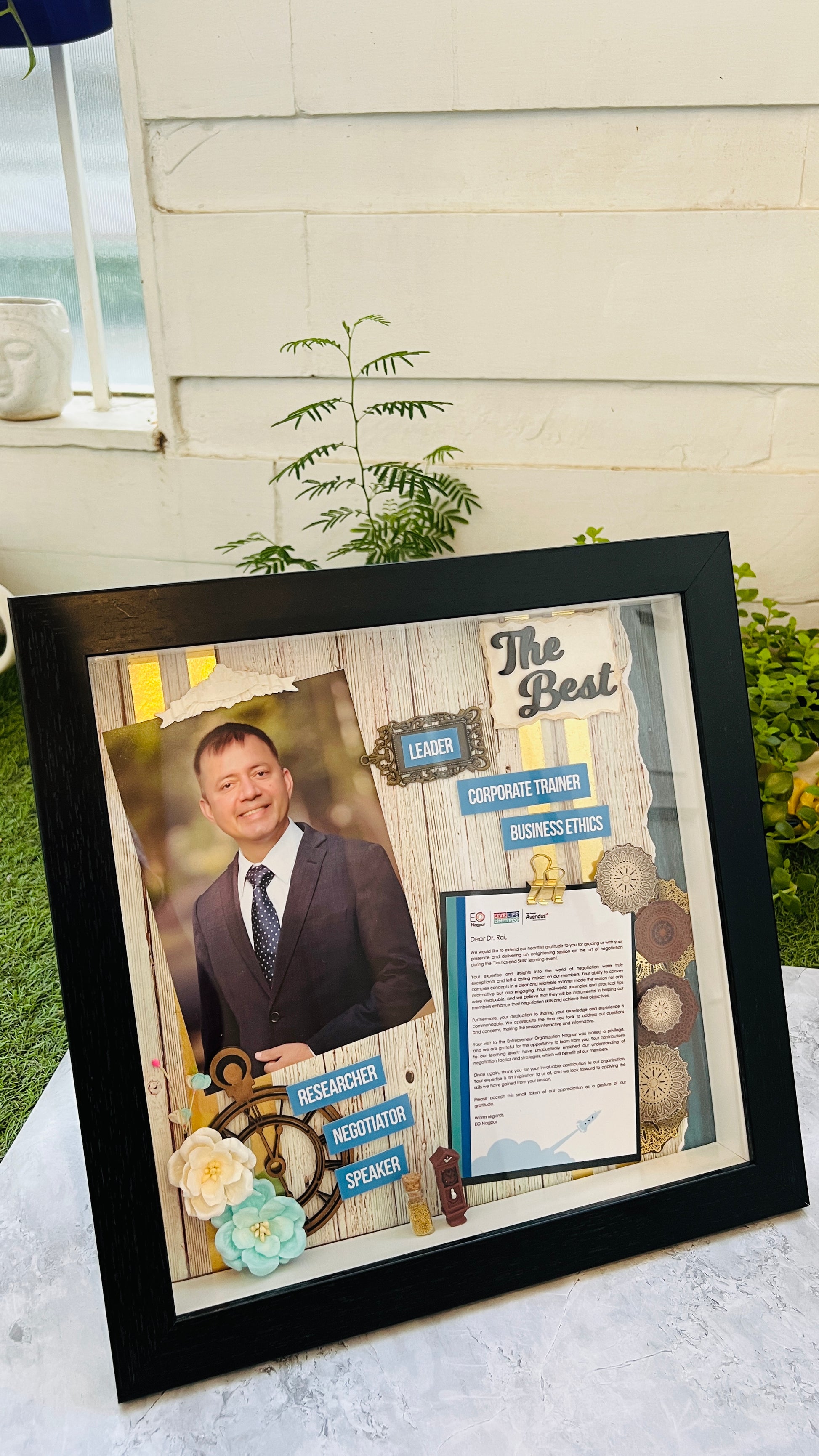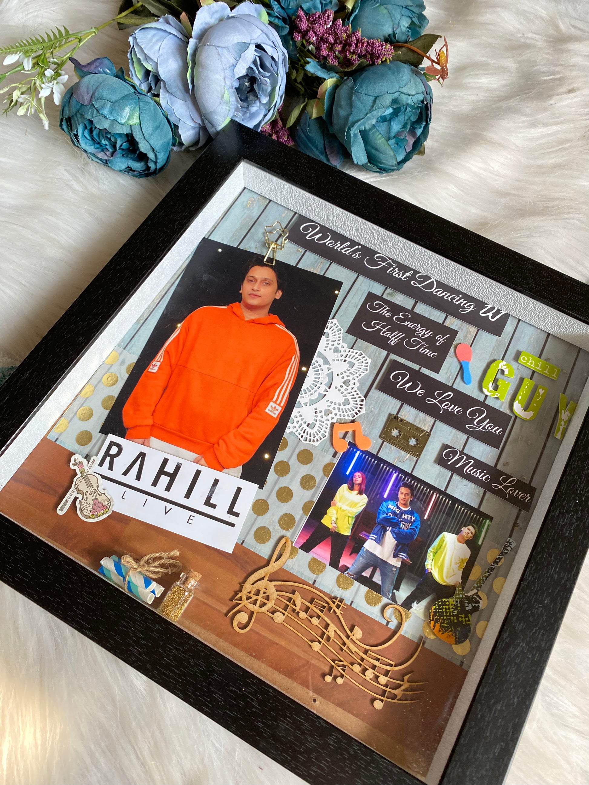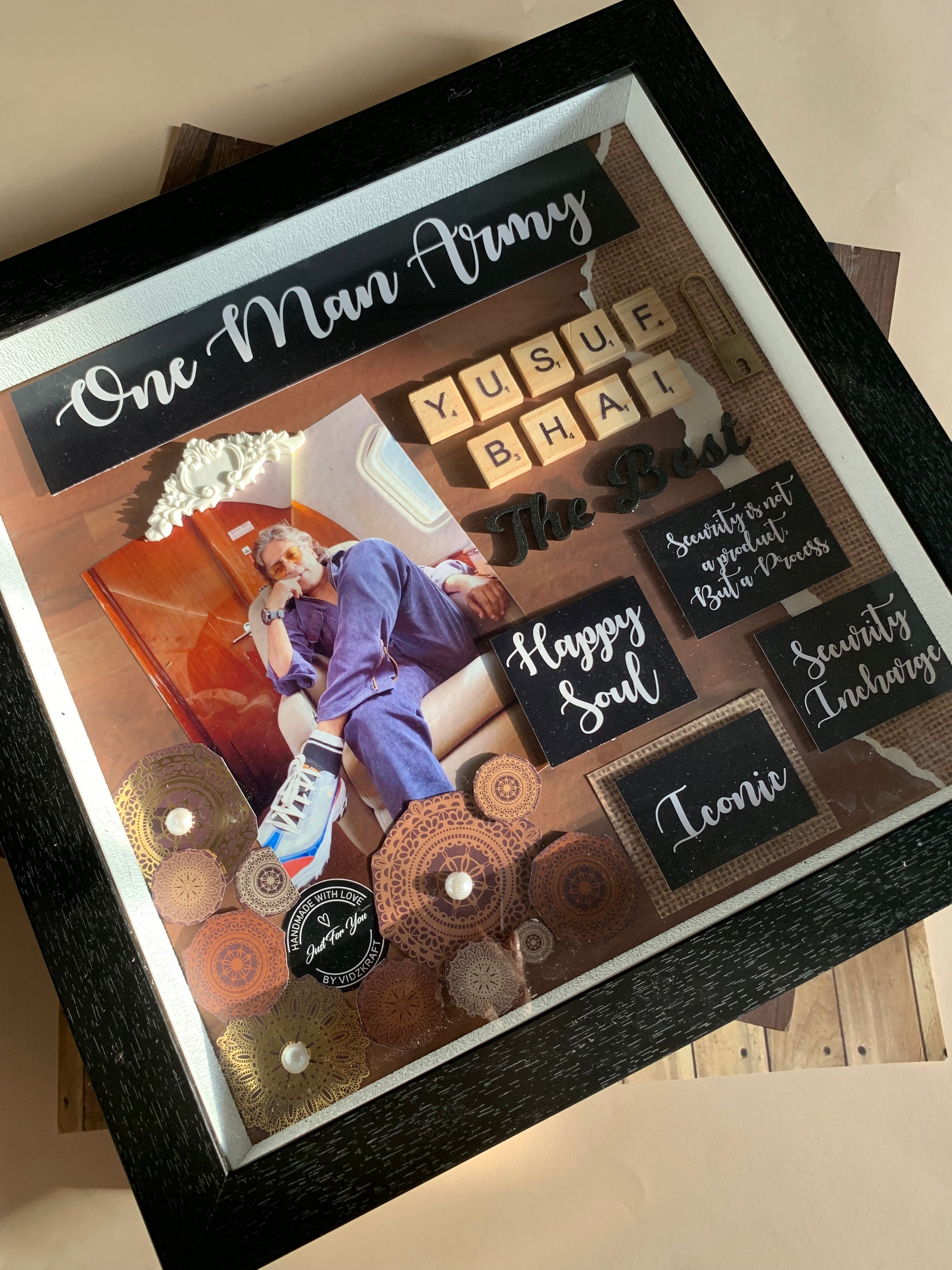 Crafted in a 14 x 14 x 2 inch size, each frame can be placed on a tabletop or mounted on the wall, making it a versatile gift that always stays visible. Every decoration is uniquely done, customized according to your pictures and the occasion — ensuring no two pieces are ever the same.