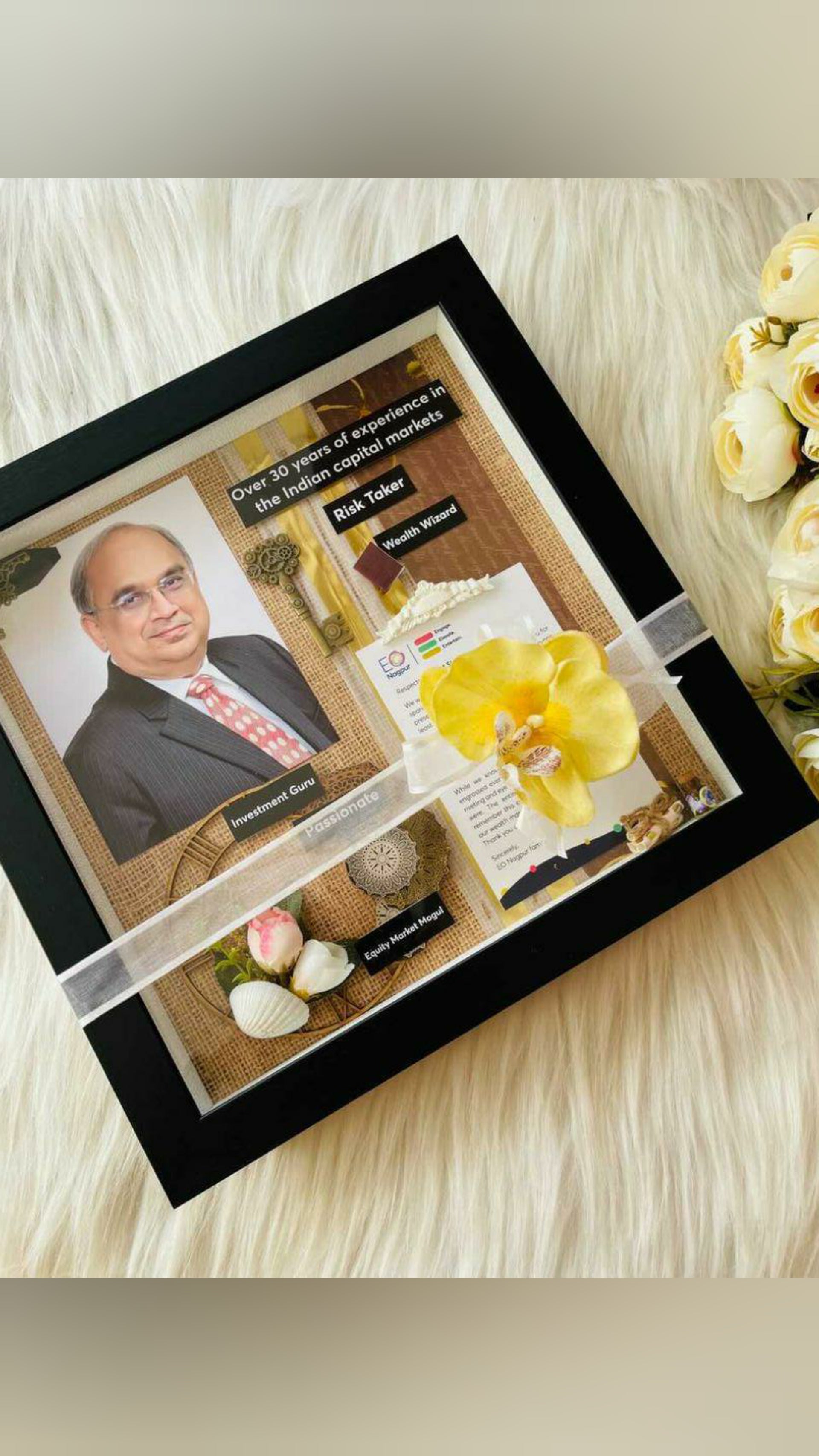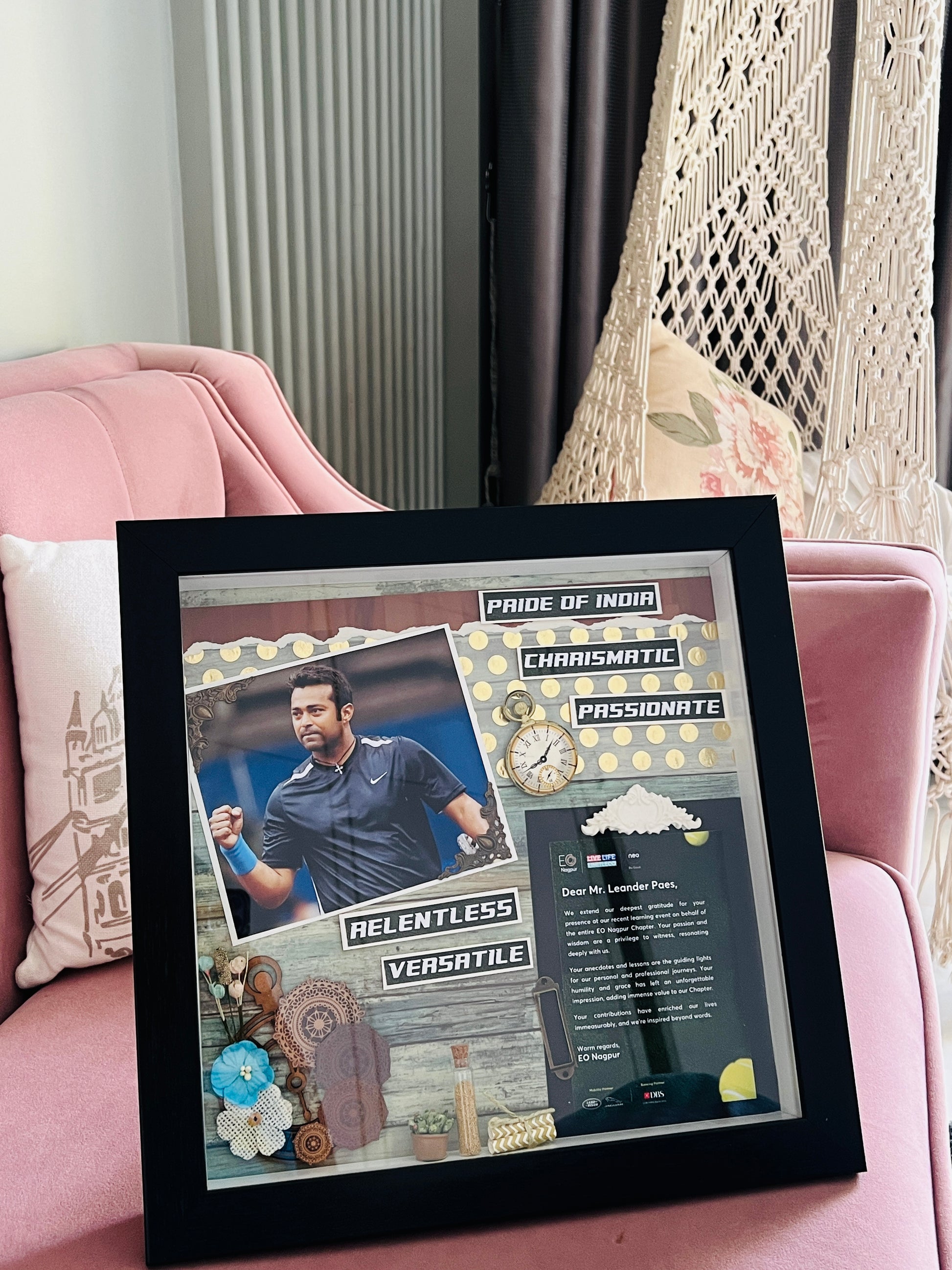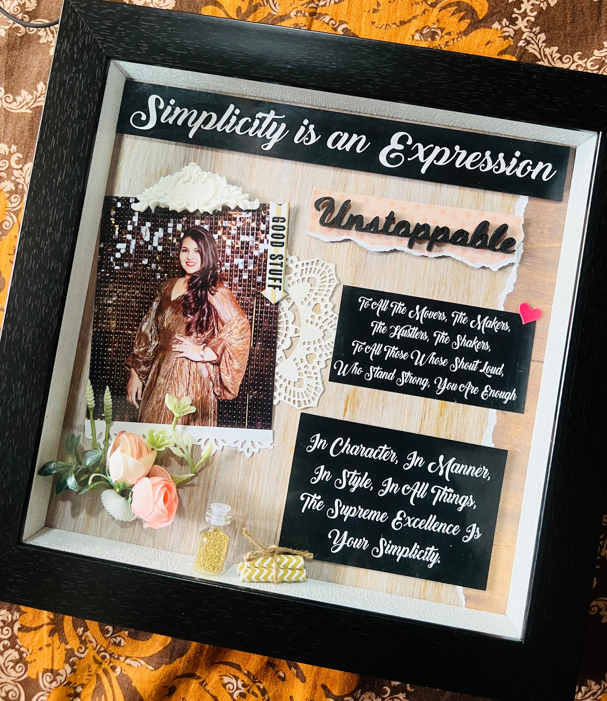 Crafted in a 14 x 14 x 2 inch size, each frame can be placed on a tabletop or mounted on the wall, making it a versatile gift that always stays visible. Every decoration is uniquely done, customized according to your pictures and the occasion — ensuring no two pieces are ever the same.